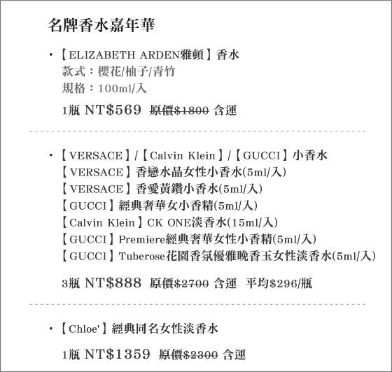 ●VERSACE、GUCCI、CK、Chloe'等香水嘉年華,尋找適合你的典藏芬芳