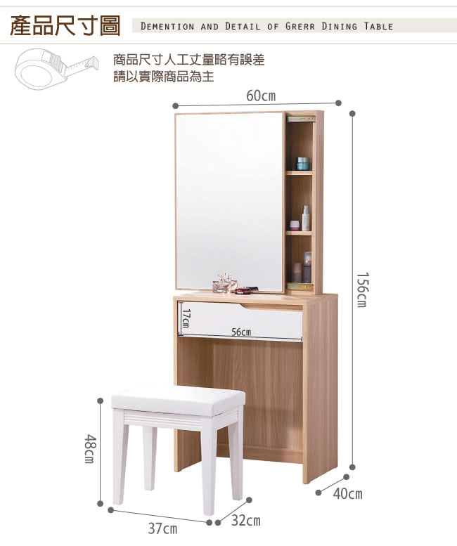 化妝台:(寬)60x (深)40 x(高)156 / 公分